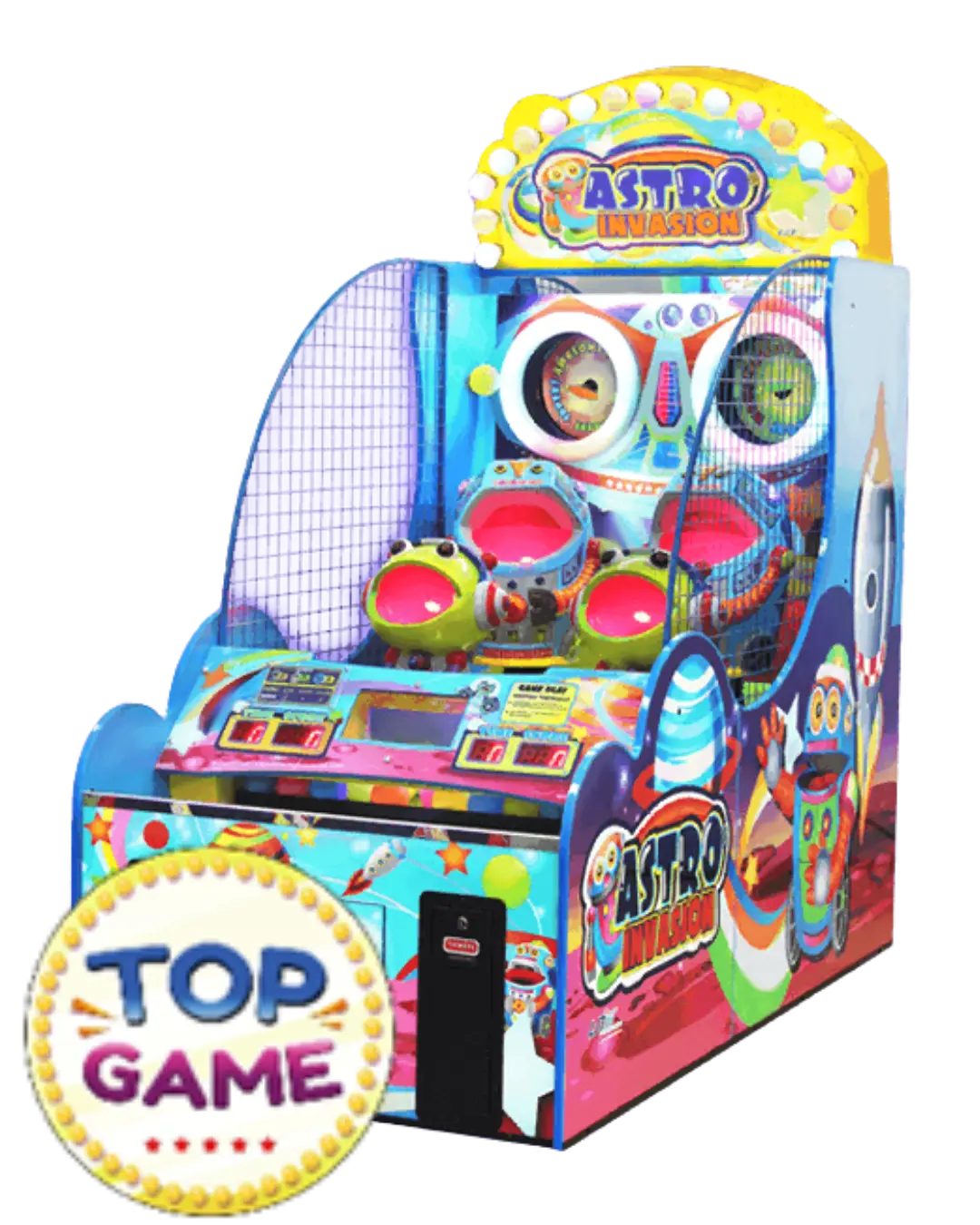 O arcade Astro Invasion é uma máquina de tiro interativa e super colorida, feita especialmente para o público infantil. Com visual galáctico e personagens alienígenas simpáticos, essa máquina transforma qualquer espaço em um ambiente divertido e cheio de luzes!