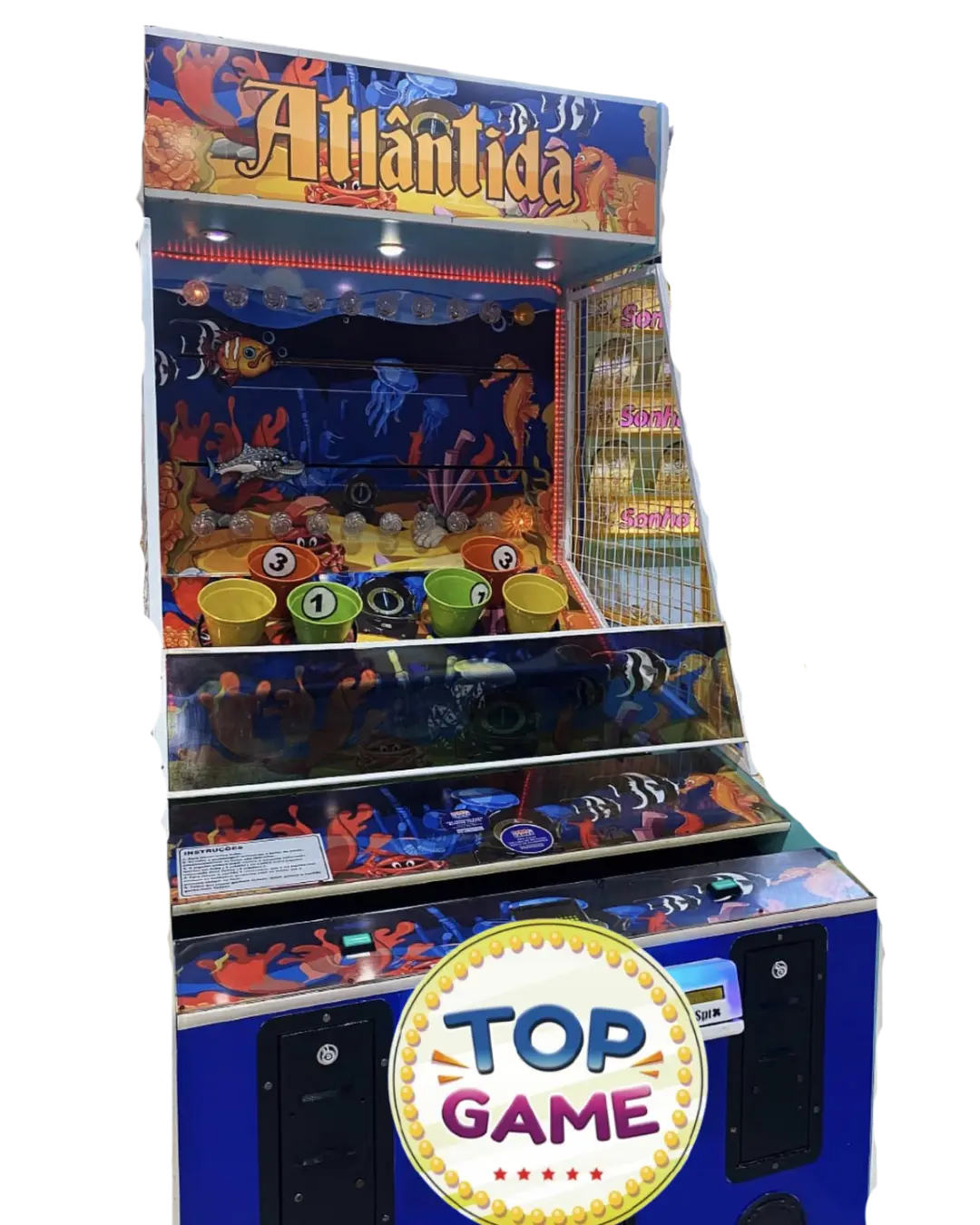 O arcade Atlântida é um jogo interativo de habilidade, perfeito para toda a família! Inspirado no fundo do mar, esse jogo desafia os jogadores a acertarem bolas em baldes coloridos para acumular pontos e ganhar prêmios.