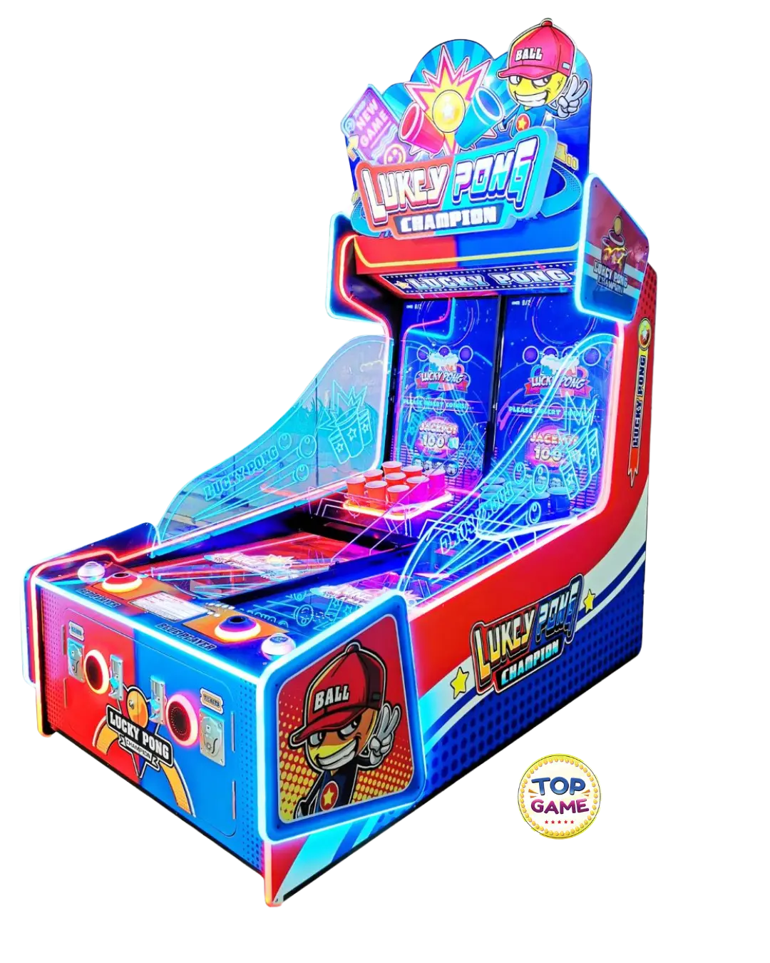 O Lucky Pong é uma máquina arcade interativa que combina mira, habilidade e agilidade. Inspirado na brincadeira do “beer pong”, mas 100% adaptado para o público de todas as idades, o objetivo é lançar bolinhas nos copos iluminados — cada acerto vale pontos, efeitos especiais e pode liberar bônus. Colorido, vibrante e com alto giro de público, é uma verdadeira estrela nos ambientes de entretenimento!