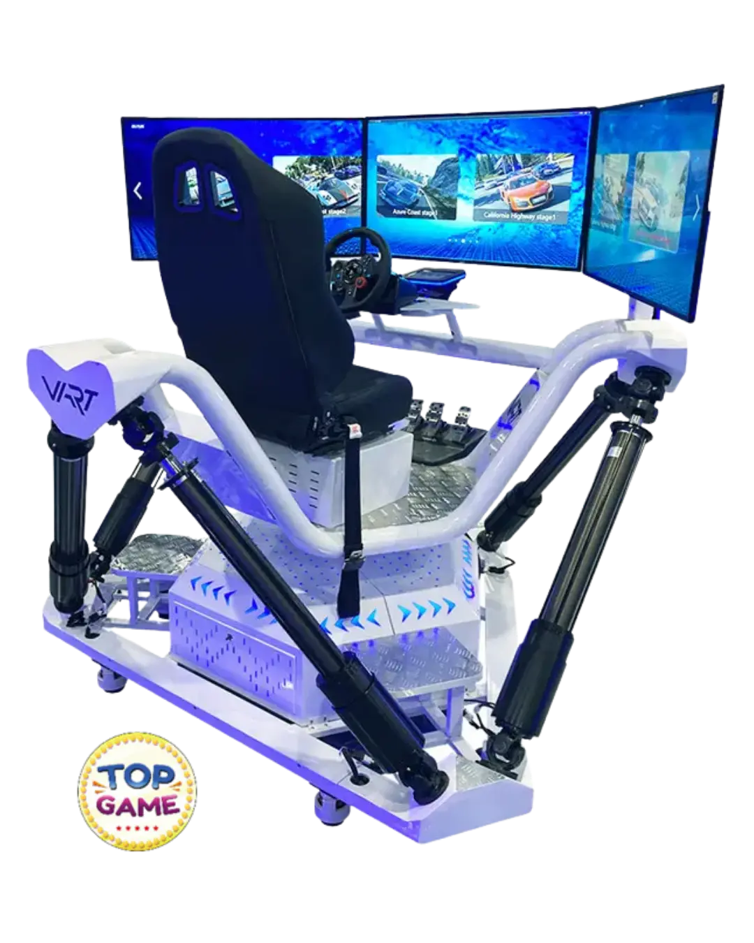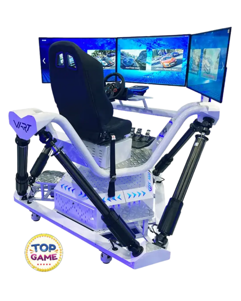 O VART VR Simulator é um simulador de realidade virtual avançado que combina movimento físico real, conteúdo VR interativo e visual panorâmico com três telas, criando uma sensação extrema de presença e realismo.